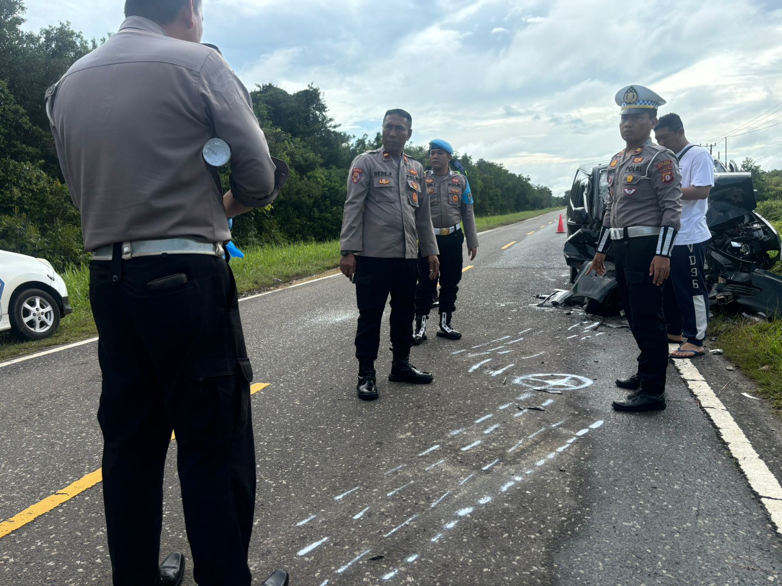 Keterangan Foto: Kasatlantas Polres Katingan Iptu Juwito bersama anggota melakukan olah TKP di Jalan Tjilik Riwut Km 23 Hampangen