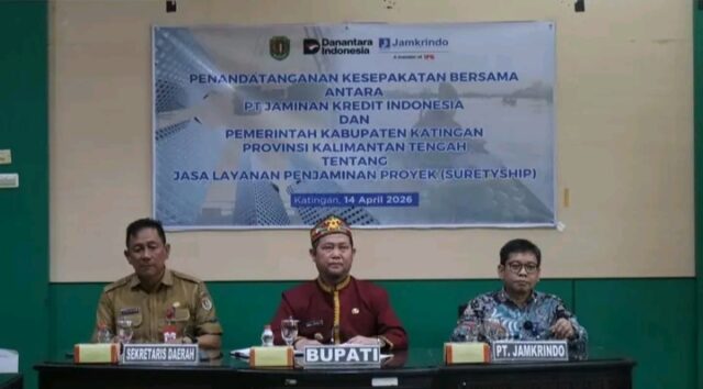 KASONGAN – Bupati Katingan, Saiful, resmi menandatangani kesepakatan bersama dengan PT Jaminan Kredit Indonesia (Jamkrindo) terkait layanan penjaminan proyek (suretyship) Penandatanganan berlangsung di Ruang Rapat Bupati Katingan,Selasa (14/4/2026).